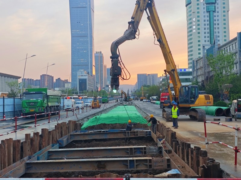 “追求精細極致,鑄就基坑支護的穩(wěn)固防線”。項目部將鋼板樁施打質量視為確?;影踩c質量的關鍵環(huán)節(jié),嚴格執(zhí)行材料準入制度,所有進場鋼板樁均經(jīng)過材質證明核查、尺寸精度測量和外觀質量檢驗三重把關,確保樁身無裂紋、無銹蝕等質量缺陷,從源頭上杜絕不合格材料。施工中,施工人員采用全站儀進行動態(tài)監(jiān)測,嚴格控制樁身垂直度偏差在規(guī)定范圍內,詳細記錄每根樁的打入深度、貫入度等關鍵參數(shù)。拔樁階段采用專用施工設備,按照“先支后拆、分段拔除”的原則有序進行,拔樁后出現(xiàn)的孔隙立即灌砂,最大限度減少對周邊土體的擾動,實現(xiàn)平穩(wěn)施工與環(huán)境保護的和諧統(tǒng)一。
