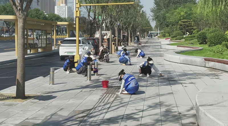 集團公司黨員干部率先垂范,職工緊密跟隨,近200名“市政藍”奔赴工程現(xiàn)場開展志愿服務(wù),齊心協(xié)力對全線南、北半幅人行道的平石及側(cè)石進行描金修復(fù)與污漬清理,同步推進地磚灌縫精細(xì)化作業(yè),細(xì)心擦拭燈桿、隔離護欄、指示牌、公交站臺等城市“家具”,勾勒出城市綠化宜居“金名片”。